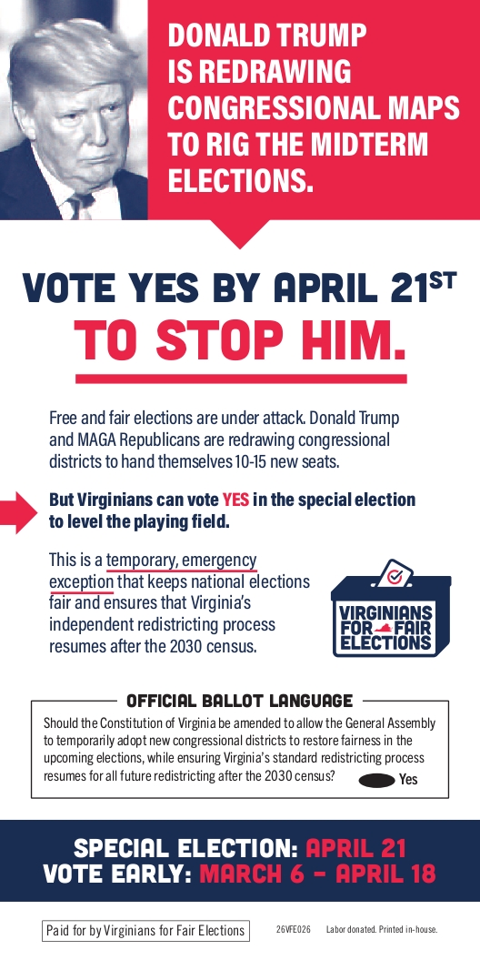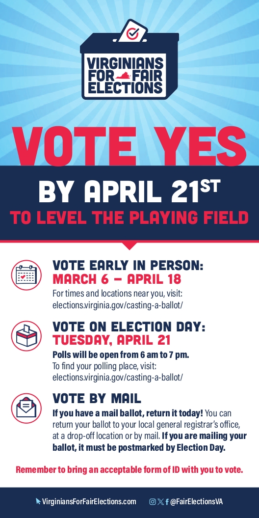 Friday March 6th-Tuesday 21 April; Vote on re-districting in Virginia